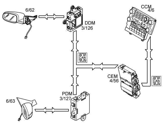 The position of the mirror is controlled using buttons on the control panel on the driver's side (3/176). The driver door module (DDM) (3/126) transmits a signal directly to the mirror on the driver's side (6/62). When adjusting the mirror on the passenger side (6/63), a signal is sent via the driver door module (DDM) to the passenger door module (PDM) (3/127) on the CAN network. The passenger door module (PDM) transmits the signal to the door mirror.