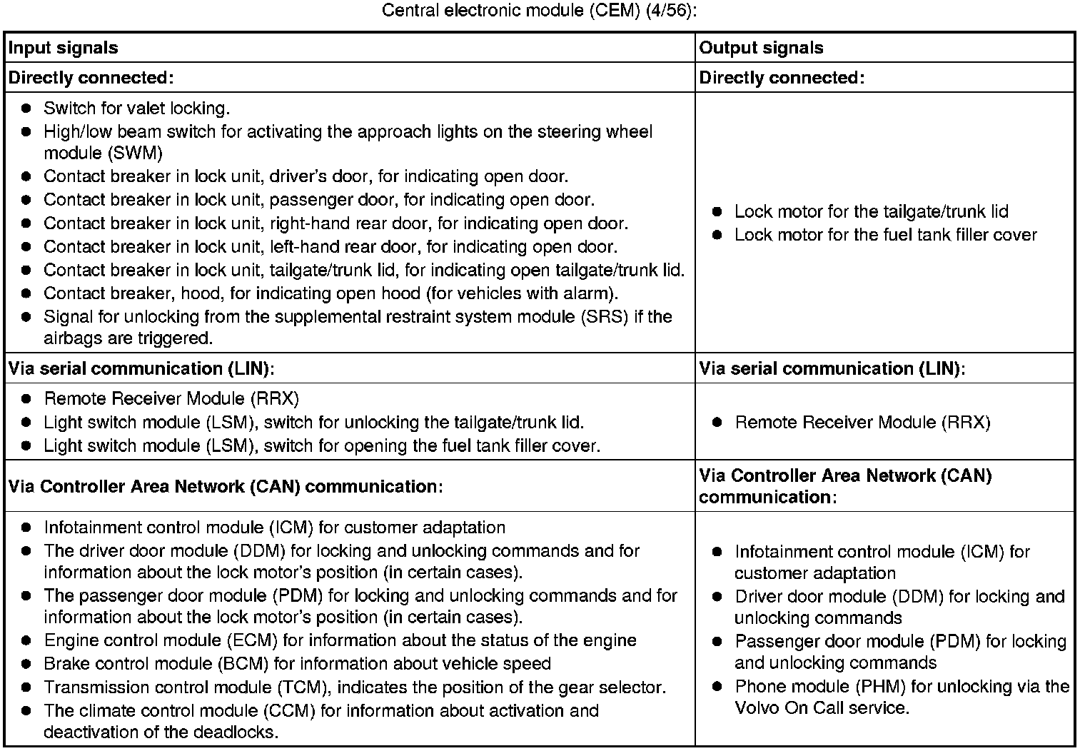 The tables below summarize the input and output signals to the units in the central locking system. The signal types are divided into directly connected signals, serial communication and controller area network (CAN) communication.