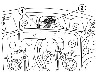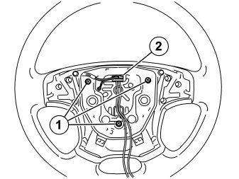 - Detach the ground cable (1) and connector (2) and remove the signal ring from the steering wheel. Put it aside.