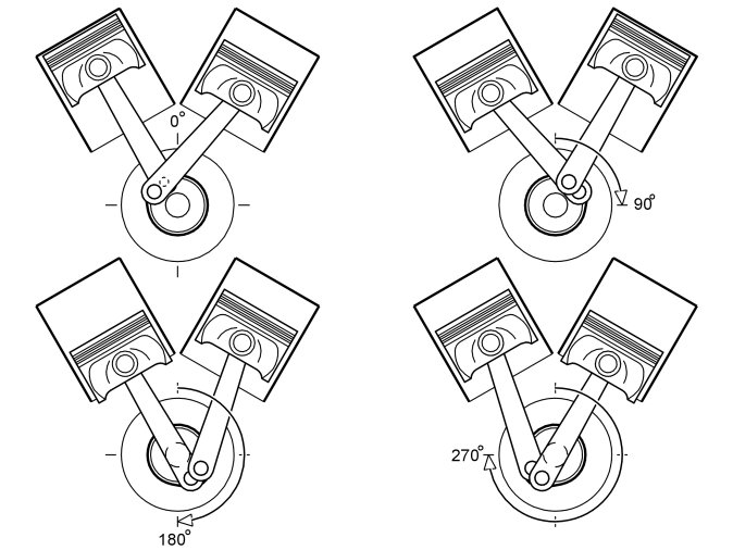 When the crankshaft has rotated 90 degrees the right hand piston is at the top and the left hand piston is halfway between the upper and lower turning points.