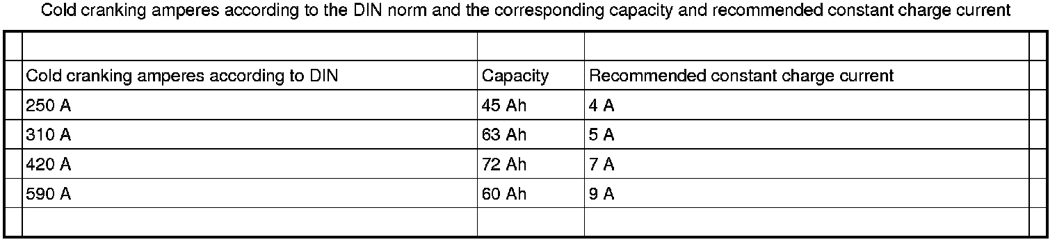 The cold cranking amperes according to the SAE and DIN norms and the corresponding capacity and recommended charge current are shown in the table below.