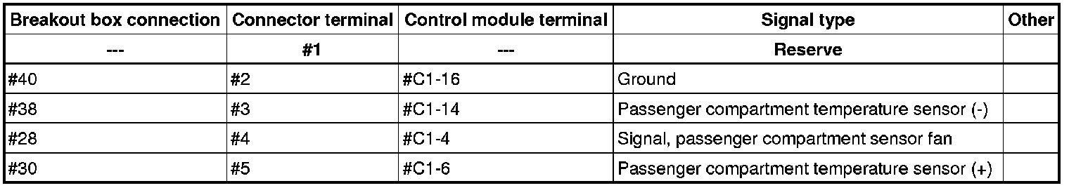 Passenger compartment temperature sensor: Resistance between terminals #30 and #38 on the breakout box should be approx. 11.99 k ohms at +20 °C. Resistance decreases as temperature increases.