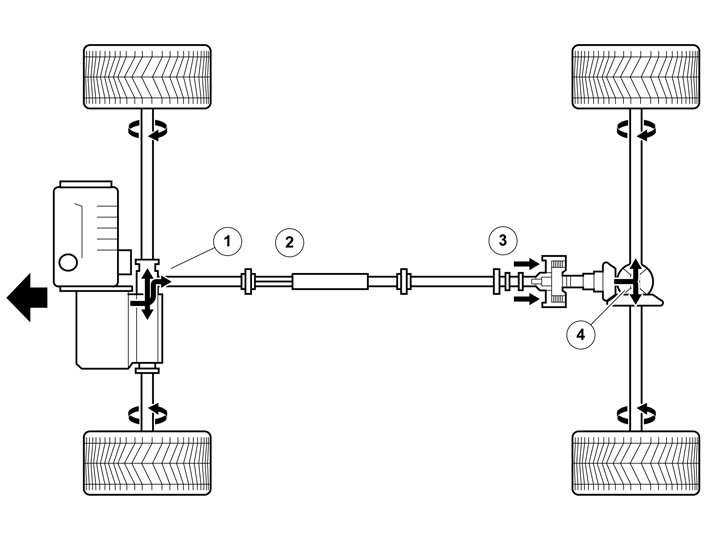 2. Propeller shaft: Transmits torque from front axle (bevel gear) to rear axle. Always rotates at the same rate as the front wheel pair.