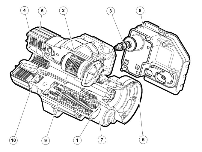 The clutch unit is located on the rear axle, between the final drive and the propeller shaft. The mechanical part is driven by the propeller shaft. The hydraulic part is driven by an electric pump.