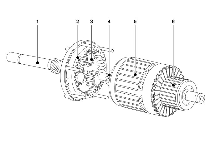 The planetary train is used to reduce the rotational speed of the pinion gear in relation to the speed of the armature and to increase the torque of the pinion.