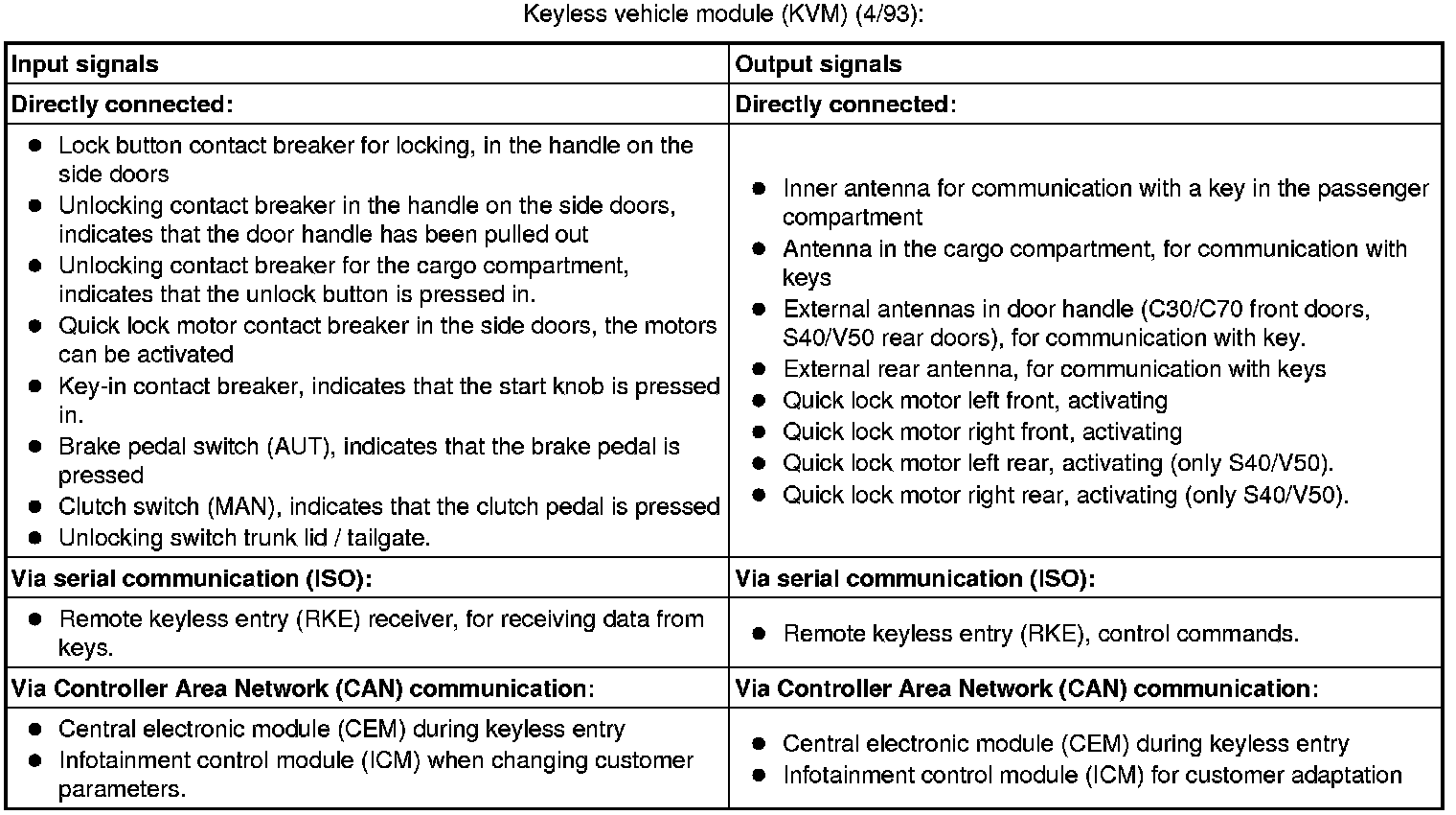 The tables below summarize the input and output signals to the units in the central locking system. The signal types are divided into directly connected signals, serial communication and controller area network (CAN) communication.