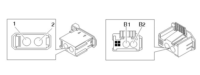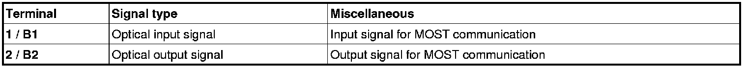 The two optical terminals in the connector are numbered in the same way on all control modules in the MOST network. The size of the plastic housing for the two optical terminals varies. A connector with integrated power supply is integrated with the optical terminals and one connector with only the optical terminals.