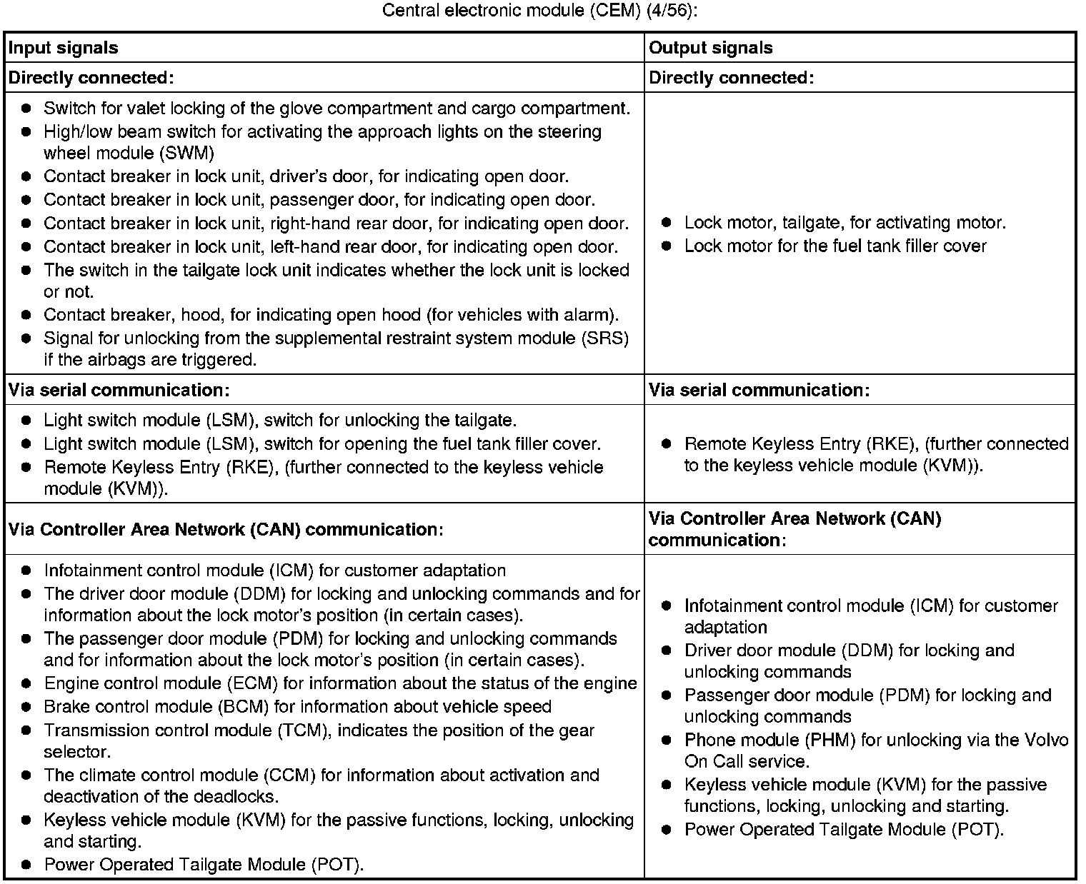 The tables below summarize the input and output signals to the units in the central locking system. The signal types are divided into directly connected signals, serial communication and controller area network (CAN) communication.