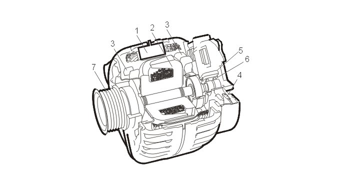 The stator is fixed and consists of grooved plates which are insulated internally and pressed together onto a fixed plate unit. Stator winding coils are positioned in the grooves. They are delta connected at 120° and provide a three phase alternating current to the rectifier bridge.