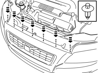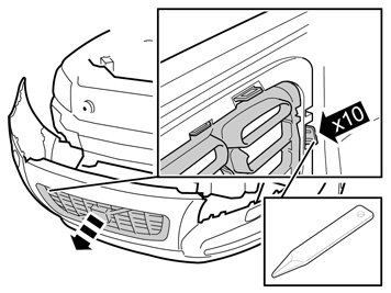 - Fold out the bumper casing's ends on both sides, they are installed with two clips to the front fender and three under the headlight.