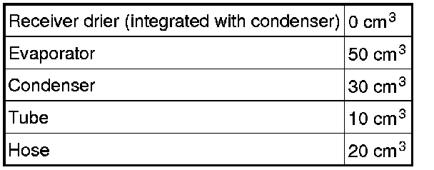 Change the oil in the compressor (reusing the compressor) or replace with the same amount that was in the old one (new compressor) according to the tables below. Carry out a performance test of the air conditioning system. Refer to: Climate control system, check Climate Control System, Check.