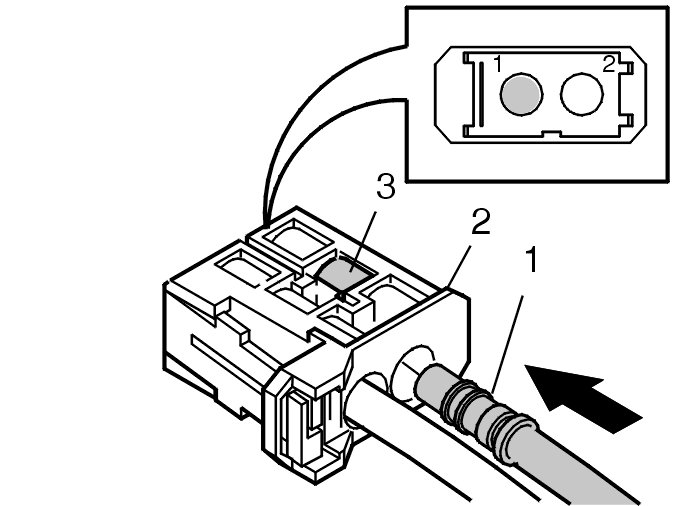 Note! Fiber optics must not be spliced.Damaged fiber optics can be repaired if there is sufficient length remaining to install a new ferrule (4). If the remaining fiber is not long enough, a new fiber optic must be routed parallel to the damaged fiber.
