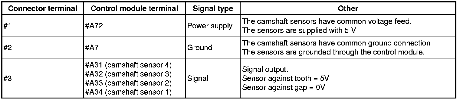 Measure voltage between #A7 and respective signal output on the camshaft sensor.