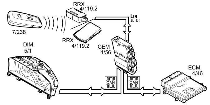 The Alcohol Analyzing Start Inhibitor communicates with the Remote Receiver Module (RRX) wirelessly, just like the vehicle's remote keys. The Remote Receiver Module (RRX) transmits information to the Central electronic module (CEM) via LIN. The Central electronic module (CEM) then communicates via the CAN network with the Driver information module (DIM) and the Engine control module (ECM).
