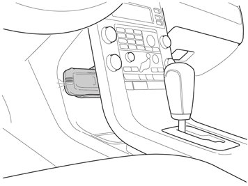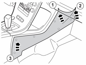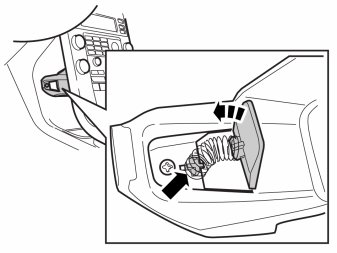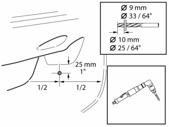 - Drill a -9 mm (33/64") hole in the panel in front of the center console as illustrated. Predrill first using a smaller drill bit. Use a drill stop.