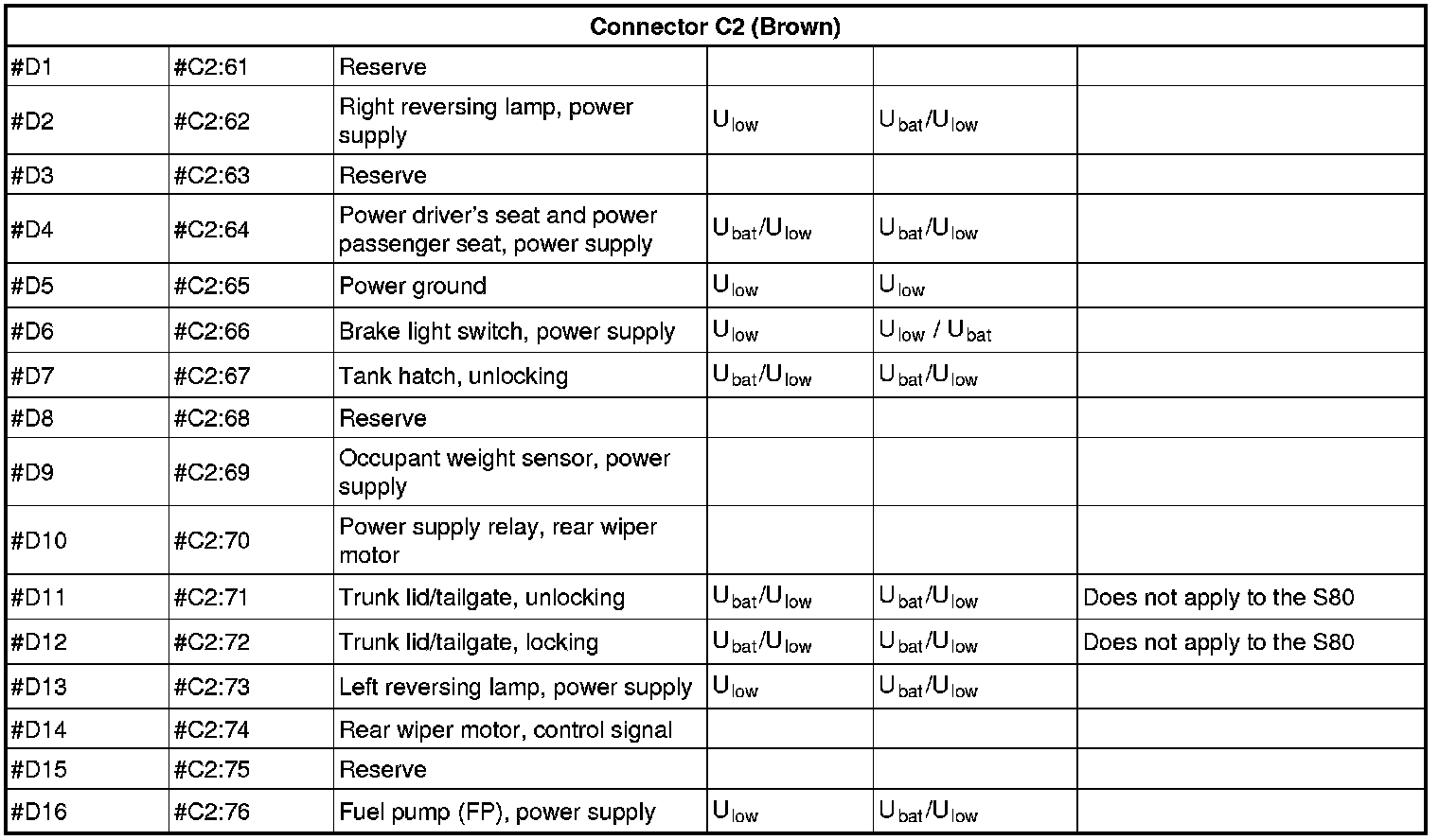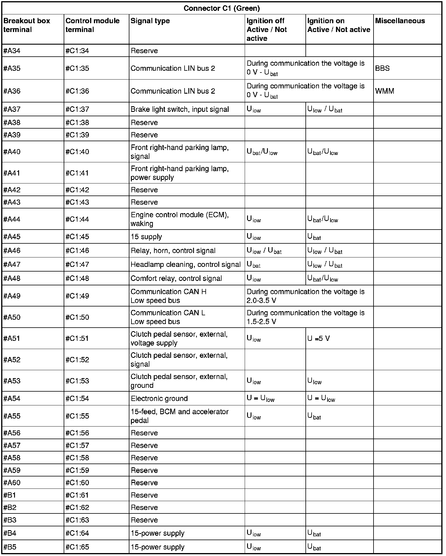 All values given below are between the terminals stated in column 1 and terminal #D5 (power ground). This applies unless otherwise indicated in the last column.