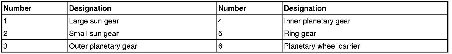 The ratios are obtained through different combinations of locked and/or connected components. The table displays the principle for how the ratios are obtained from large ratio, 1, to small ratio, 6, and counter rotation (i.e. reverse with large ratio).