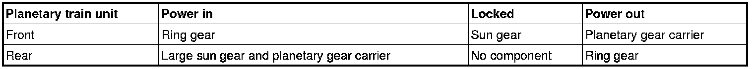 The rear planetary train rotates clockwise. Because the rear planetary train's inner and outer planetary gears are in constant engagement with each other, they are kinetically locked in relation to each other. The kinetic energy from both the rear planetary train's sun gears is therefore transferred to the rear planetary train's ring gear.