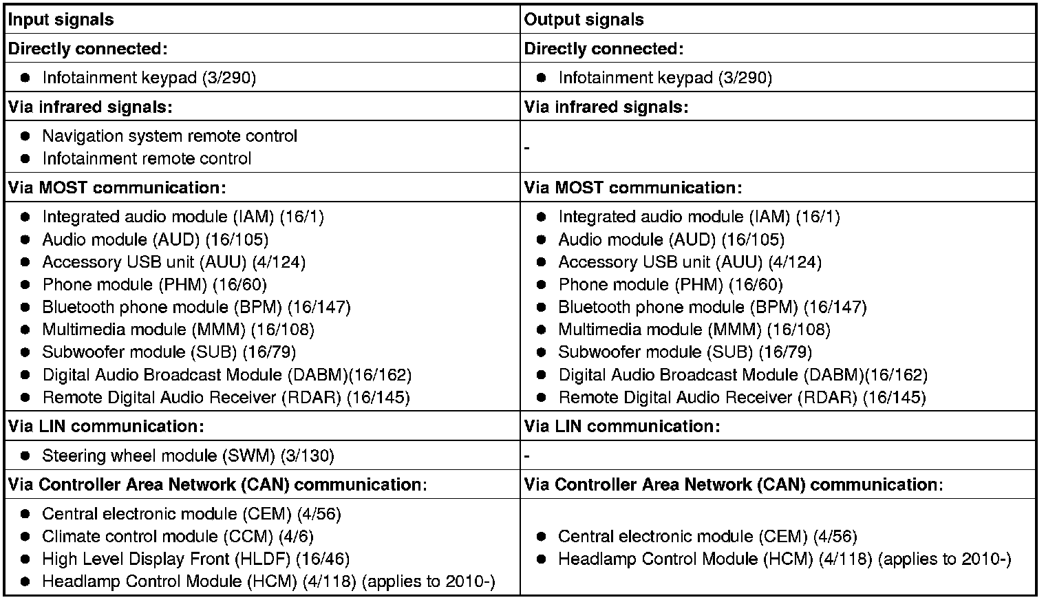The table below summarizes the input signals to and output signals from the Infotainment Control Module (ICM). The signal types are divided into directly connected infrared (IR) signals, MOST communication, LIN communication and CAN communication. The illustration below displays the same information with the Volvo component designations.