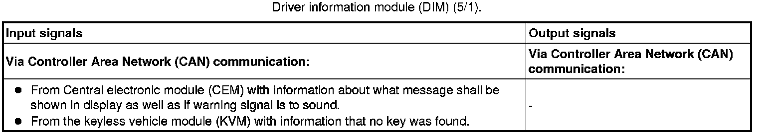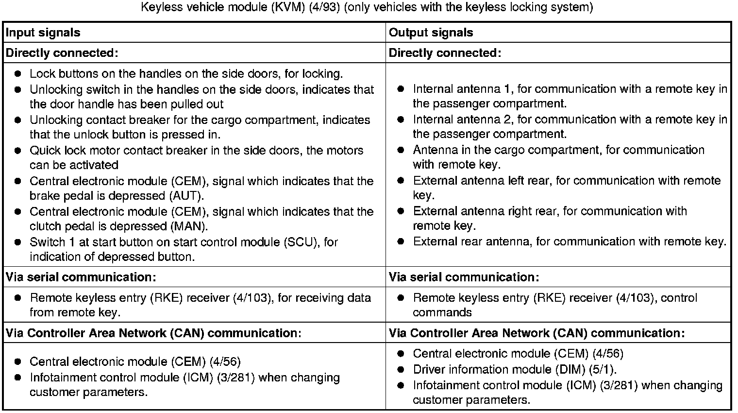 The tables below summarize the input and output signals to the units in the system for the immobilizer. The signal types are divided into directly connected signals, serial communication and controller area network (CAN) communication.