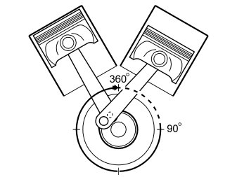 When the crankshaft has rotated 90 degrees the right hand piston is at the top and the left hand piston is halfway between the upper and lower turning points.