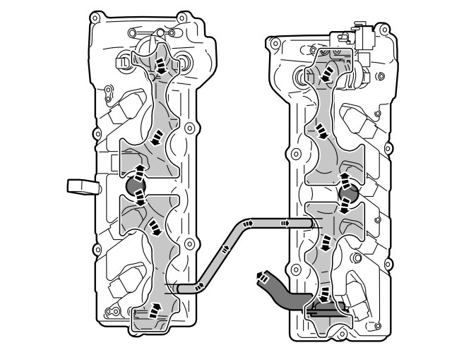 The ventilation is pressure controlled to retain stable pressure in the crankcase. A pressure regulator is installed on the rear edge of the right valve cover. The gases which are evacuated are led from the regulator through a hose to a connection on the inlet pipe. Coolant is circulated around the connection to prevent freezing.