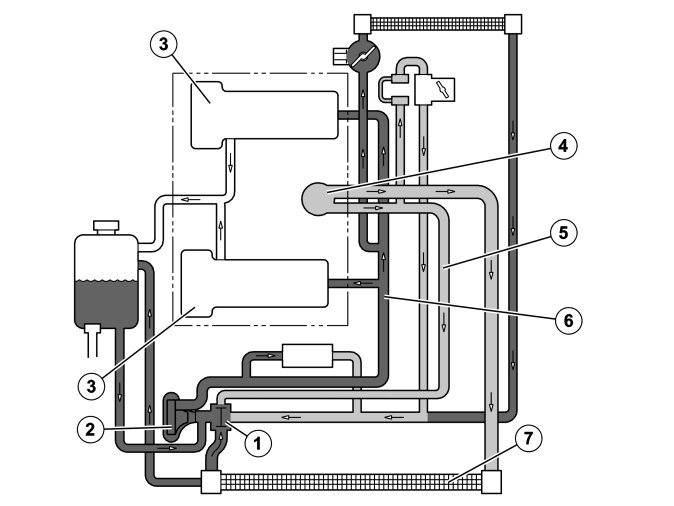 - Open thermostat through the radiator (7) to the coolant pump. The coolant also flows through the bypass pipe back to the coolant pump.