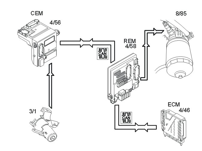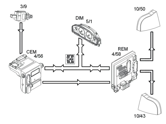 The central electronic module (CEM) transmits the data via the controller area network (CAN) to the rear electronic module (REM) which activates the lamps.