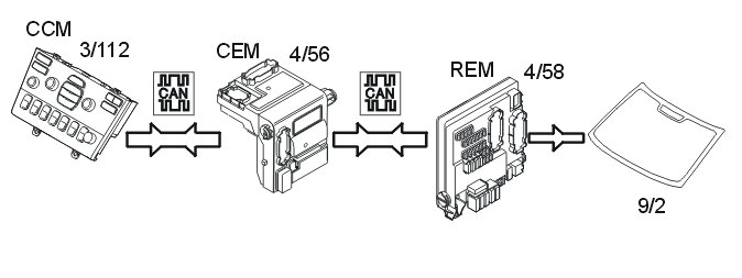 Rear demist (9/2) is activated by pressing the switch on the climate control module (CCM) (3/112). The climate control module (CCM) transmits the data via the Control area network (CAN) to the central electronic module (CEM) (4/56). The central electronic module (CEM) checks that the conditions to start the demist have been met. If the conditions are met, a request is transmitted via the controller area network (CAN) to the rear electronic module (REM) (4/58) to activate the relay. The rear electronic module (REM) powers the relay and the demister is powered.