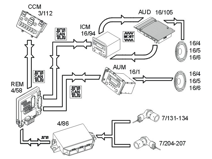 The rear electronic module (REM) then transmits a signal to the audio module (AUM) on the controller area network (CAN). On the XC90 this signal is sent to the Infotainment Control Module (ICM).