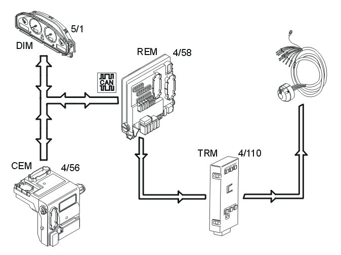 The rear electronic module (REM) (4/58) receives messages on the controller area network (CAN) from the central electronic module (CEM) (4/56) about when output signals to the turn signal lamps, parking lamps, back-up lamps and fog lamps should be activated. The rear electronic module (REM) then transmits a direct signal to the trailer module (TRM).