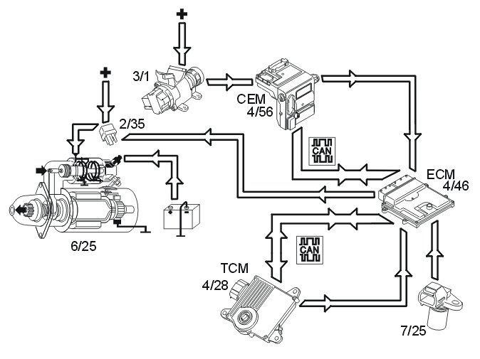 The starter motor (6/25) is supplied with power via the starter motor relay (2/35), the starter motor relay is controlled by the engine control module (ECM) (4/46).