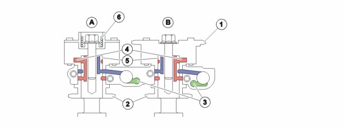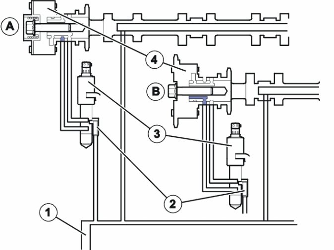 The difference in function between the exhaust camshaft (A) and inlet camshaft (B) CVVT unit is that the exhaust camshaft CVVT unit is equipped with a spring. The force of the spring makes the CVVT unit deploy the camshaft. The function causes faster deployment of the exhaust camshaft at engine start-up, before the oil pressure build in the engine.
