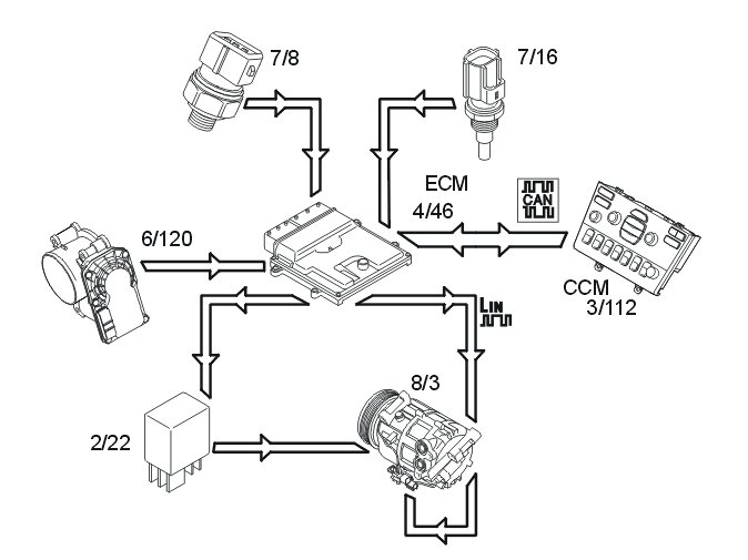 The climate control module (CCM) transmits information to the engine control module (ECM), which determines what must be prioritized. For example, the air conditioning (A/C) compressor in certain extreme cases is switched off completely, regardless of the climate control module (CCM) request. This is to prevent negative engine performance and to protect the air conditioning (A/C) system. As well as the information from the climate control module (CCM), the engine control module (ECM) controls the air conditioning (A/C) compressor based on the information from: