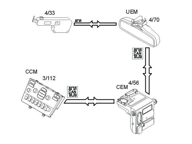 The signal transfer occurs internally in the rear view mirror, and is carried out directly between the upper electronic module (UEM) and the anti-dazzle function.