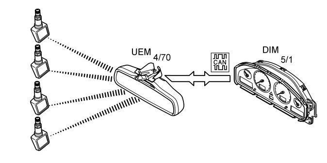 The system covers the upper electronic module (UEM) (4/70) and the sensors in the wheels. The sensors in the wheels are activated when the vehicle exceeds 40 km/h (25 mph). The sensors then start to transmit data messages approximately once per minute, which are received by the remote control receiver in the Upper electronic module (UEM). These messages contain the sensor's ID number and air pressure in the tire where the sensor is mounted.