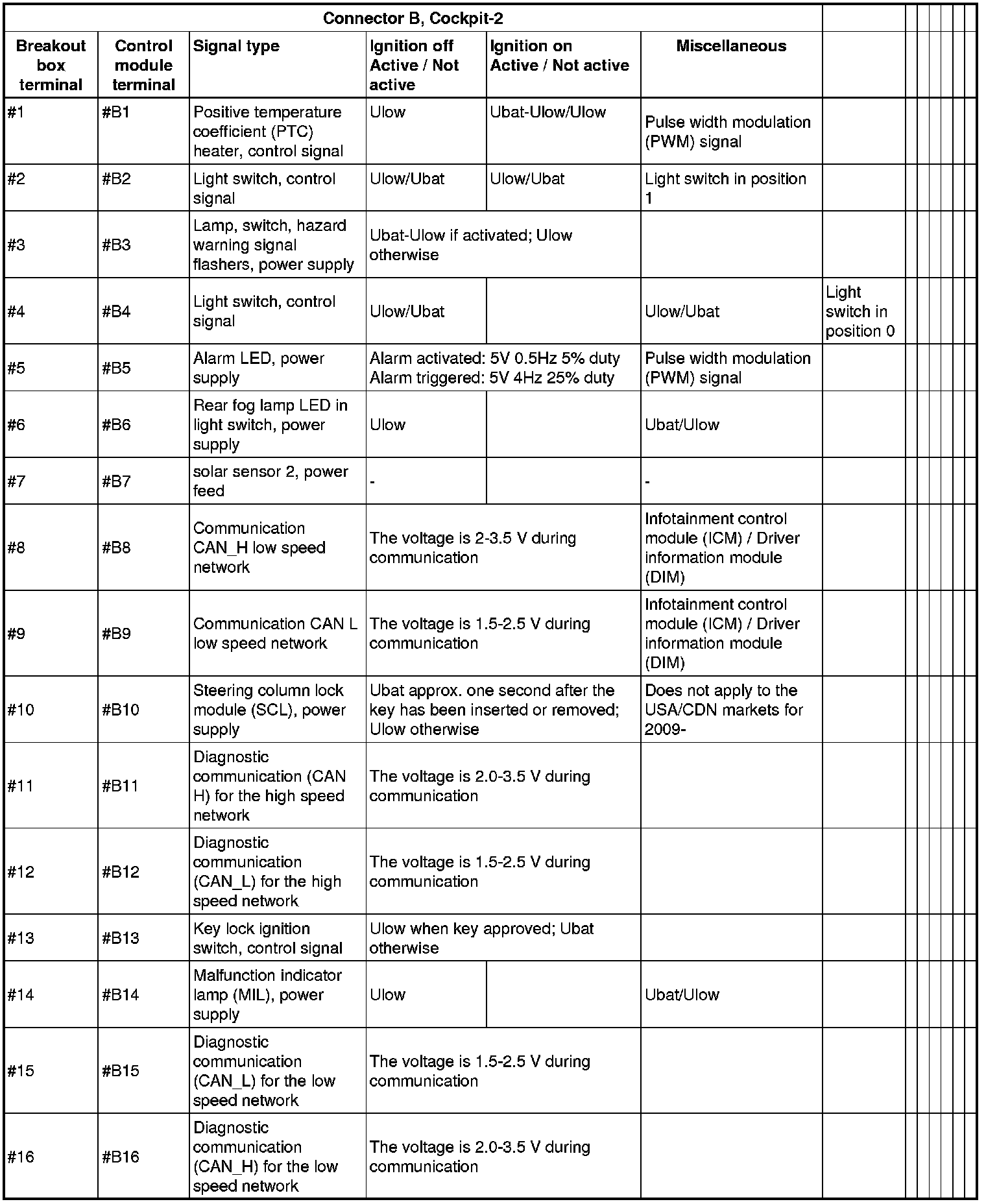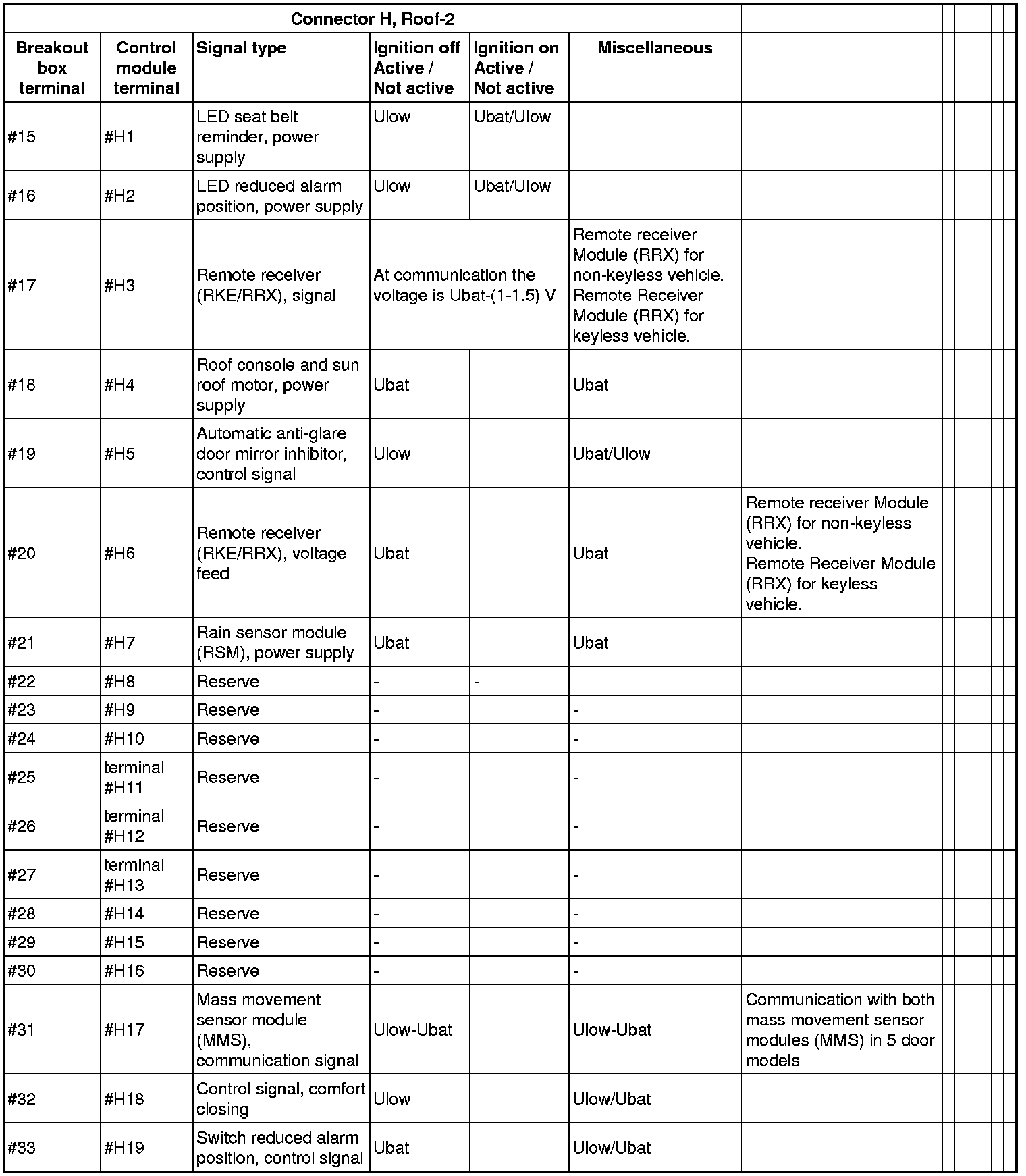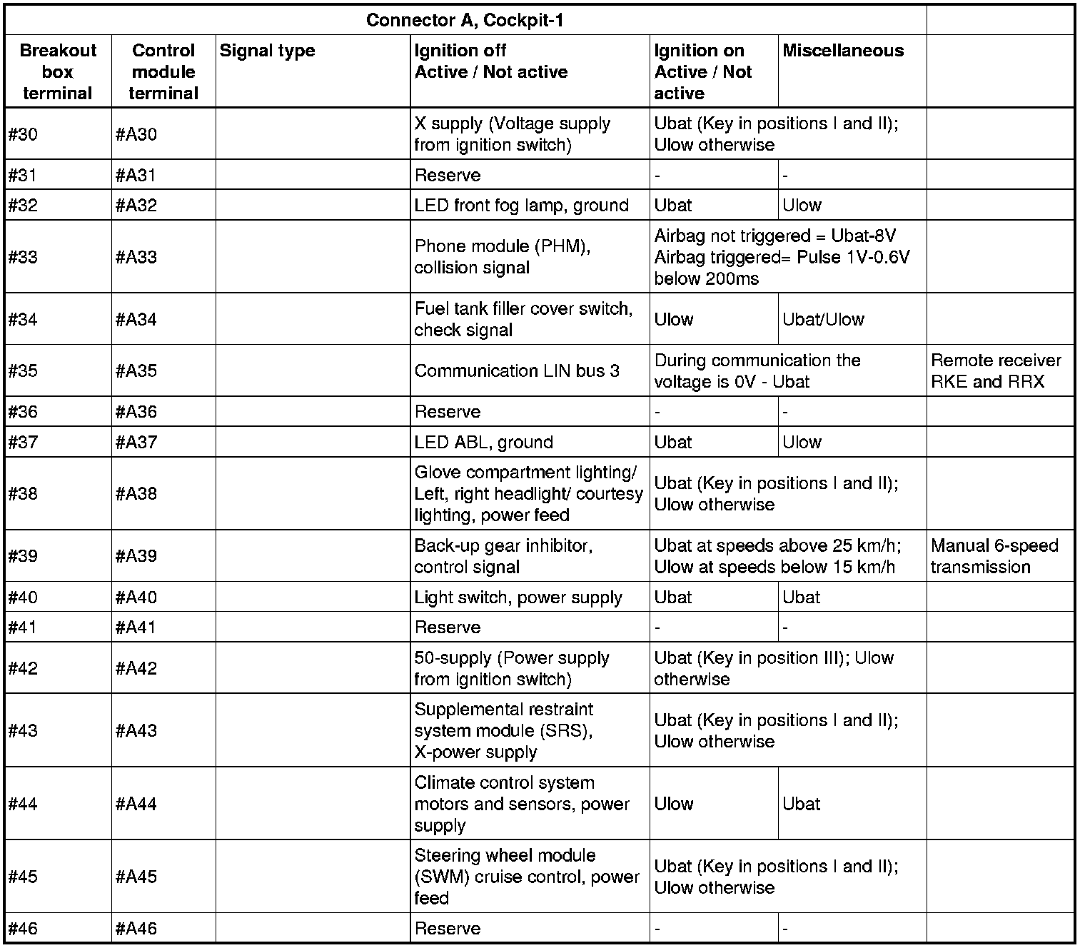 All the values given below are between the connections in column 1 and connection #A28 in column 2 (power ground). This applies unless otherwise indicated in the last column.