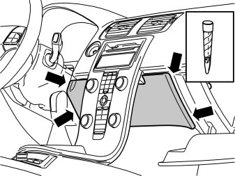 - Remove the ventilation outlet by carefully inserting special tool 9995919 between the ribs and carefully pulling up the four catches on the lower edge. Carefully pry using a weatherstrip tool.