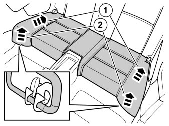 - Remove the rear tunnel compartment by pulling it upward (1) rearward (2) so that it releases from its catches.