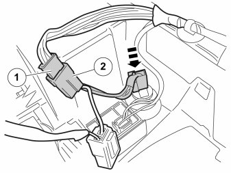 - Remove the new cable harness from the kit and connect the 12V outlet's black male connector (1) to the equivalent white female connector (2) on the routed adapter cable.