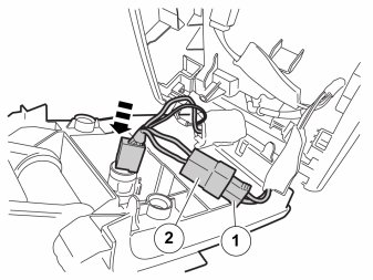 - Connect the connector (1) that was removed from the 12V outlet to the female connector (2) on the routed cable.
