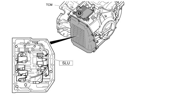 The lock-up solenoid, SLU is located in the transmission control system, which is fitted on the front edge of the gearbox. The lock-up solenoid, SLU consists of an electrical coil which controls a hydraulic valve. The solenoid is controlled with a pulsed (PWM) voltage and is grounded via the Transmission Control Module (TCM). The solenoid controls torque converter lock-up engagement. The engagement takes place by means of the solenoid being pulsed in, which enables a gentle engagement of the lock-up function. The solenoid permits the torque converter to work in one of three positions: "Open", "Controlled slipping" and "Locked". The hydraulic function of the solenoid is linear.