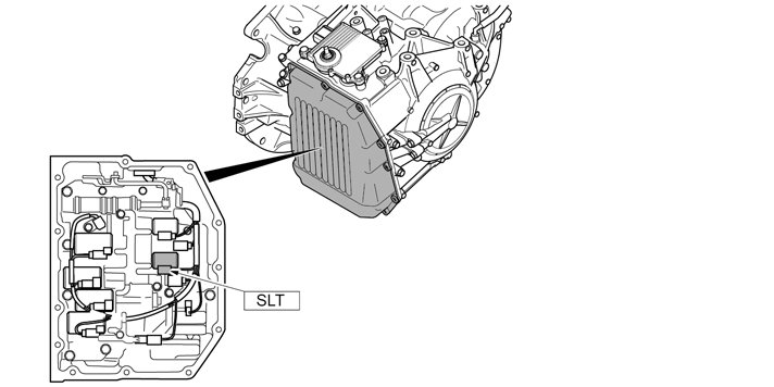 The linear pressure solenoid, SLT is located in the transmission control system, which is fitted on the front edge of the gearbox. The linear pressure solenoid, SLT consists of an electrical coil which controls a hydraulic valve. The solenoid is controlled with a pulsed (PWM) voltage and is grounded via the transmission control module (TCM). The hydraulic function of the solenoid is linear. The hydraulic valve is controlled by the varying current resulting from the current pulse ratio. With a high pulse ratio, i.e. high current strength (approx. 1 A), the system pressure is low, and with a low pulse ratio, i.e. low current strength, the system pressure is high. In the event of an open circuit the system pressure is at a maximum which results in hard gearshifts. Here the hydraulic valve is fully open.
