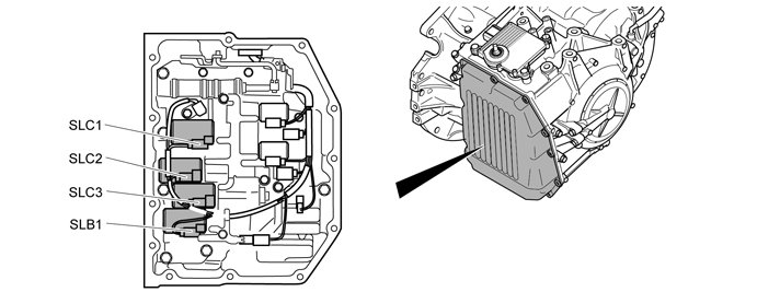 The linear pressure solenoids, SLC1, SLC2, SLC3 and SLB1 are located in the transmission control system, which is fitted on the front edge of the gearbox. The designation of the solenoid is linked to the component (clutch/brake band) that the solenoid controls. The linear pressure solenoids consist of an electrical coil which controls a hydraulic valve. The solenoids are controlled with a pulsed (PWM) voltage and are grounded via the transmission control module (TCM). The hydraulic function of the solenoids is linear. The hydraulic valves are controlled by the varying current resulting from the current pulse ratio. With a high pulse ratio, i.e. high current strength (approx. 1 A), the system pressure is low, and with a low pulse ratio, i.e. low current strength, the system pressure is high. In the event of an open circuit the system pressure is at a maximum which results in hard gearshifts. Here the hydraulic valve is fully open.
