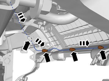 - Route the cable under the cradle (1) for the A-pillar and back.
