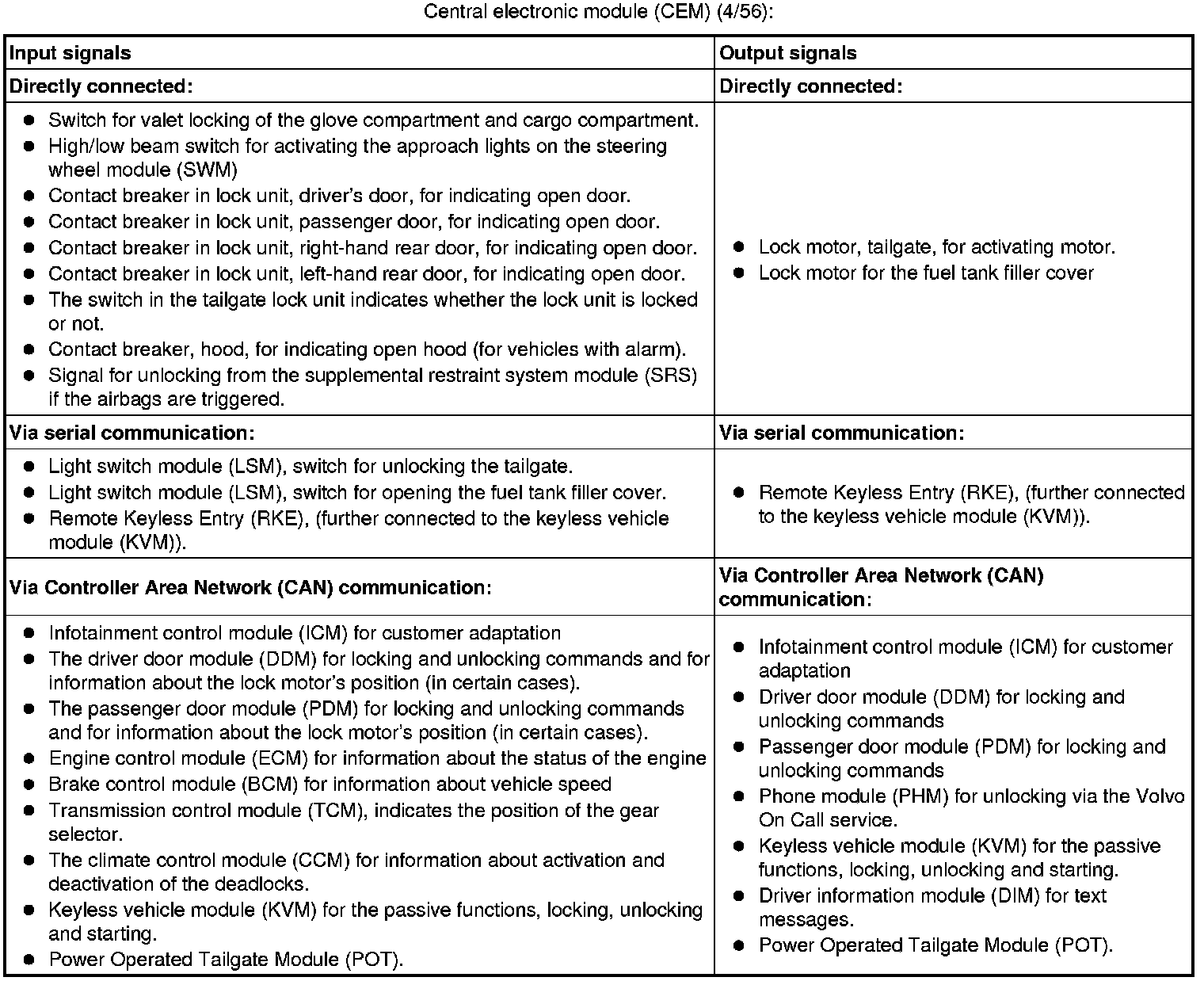 The tables below summarize the input and output signals to the units in the central locking system. The signal types are divided into directly connected signals, serial communication and controller area network (CAN) communication.