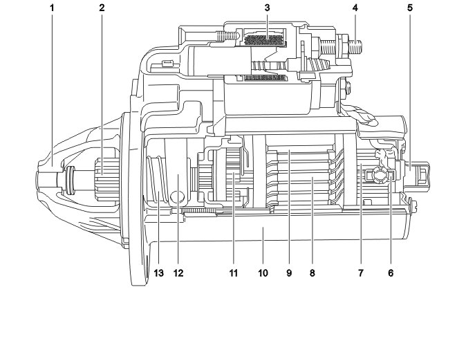 Note! Starter motor for V8 engine is equipped with field winding instead of permanent magnets. The field windings are electrically connected in series by carbon brushes.