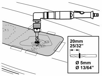 - Predrill the holes according to the template using a -5 mm (13/64") drill bit. Fit a 20 mm (25/32") drill stop. Drill square to the dashboard where the holes are to be positioned.