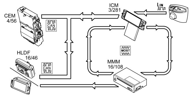 The remote control for the multimedia module (MMM) (16/108) has the same functions as the steering wheel buttons. It can be used for controlling the menus on the screen. This occurs through the IR signal being transmitted from the remote control to an IR receiver on the infotainment control module (ICM), which in turn transmits the signal on to the High Level Display Front (HLDF) on the CAN network.