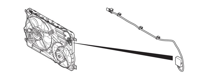 The engine cooling fan (FC) consists of two fans and two control modules. The control modules are controlled by the same signal from the engine control module (ECM).